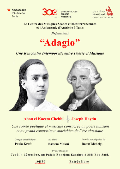 Le Centre des Musiques Arabes et Méditerranéennes, en partenariat avec l’Ambassade d’Autriche en Tunisie, organise une rencontre intemporelle entre poésie et musique intitulée « Adagio », présentée par l'artiste autrichienne Paula Kraft, le pianiste tunisien Bassem Makni, ainsi que M. Raouf Medelgi, et ce le jeudi 4 décembre 2025 au Palais Ennejma Ezzahra à 19h30.
