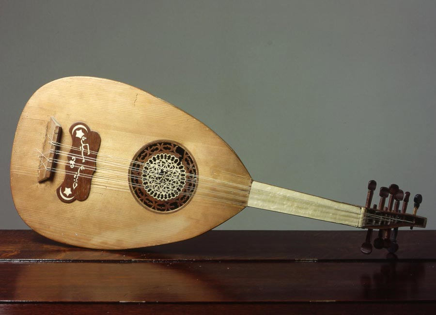 plucked string instrument played with a plectrum, well-rounded pear-shaped box;; the table has one opening adorned with a rose motif ; this Oud of the near-eastern type has five double strings. According to an inscription figuring on its table, the oud belonged to the famous Tunisian Jewish singer of the 20’s and 30’s Habiba M’sika..